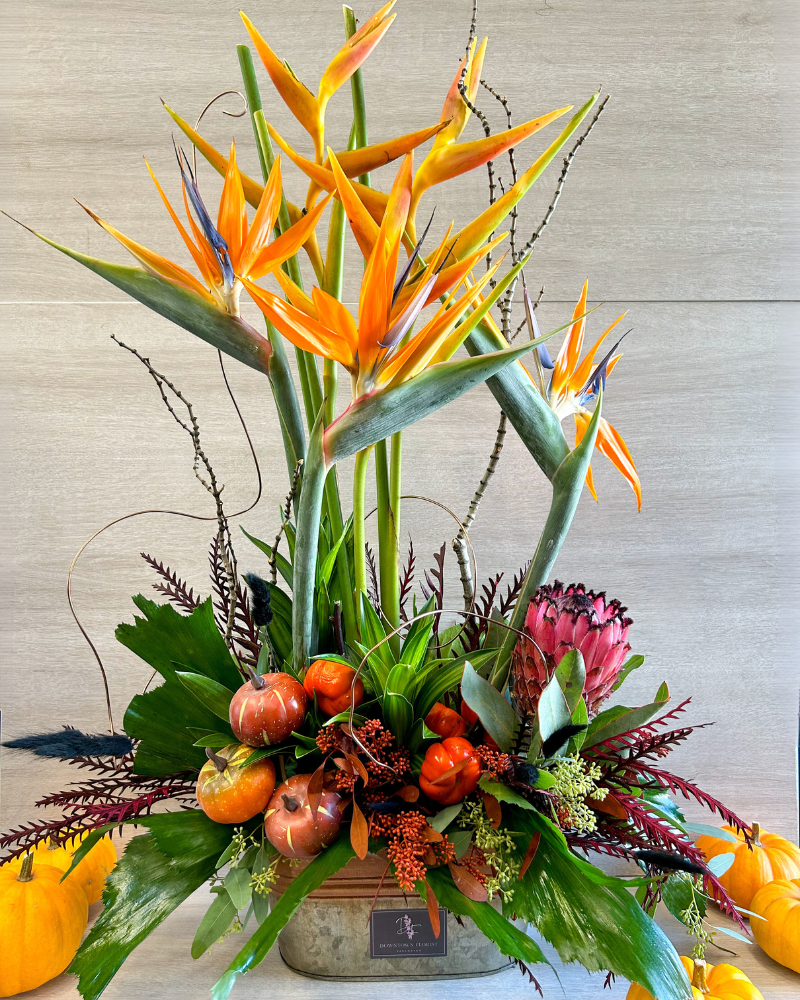 Autumn Birds is a mesmerizing fall arrangement that captures the essence of the season in a burst of vibrant colors and artistic creativity. Featuring striking birds of paradise, elegant white pumpkins, exotic protea, and intricate wiring, this arrangement is a showstopper.