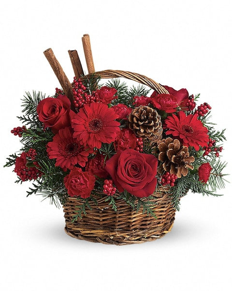 Festive red roses, gerberas, carnations and berries are arranged to look their holiday best when mixed with cinnamon sticks and pinecones in a lovely wicker basket. It's a great way to get a handle on your holiday gift list!