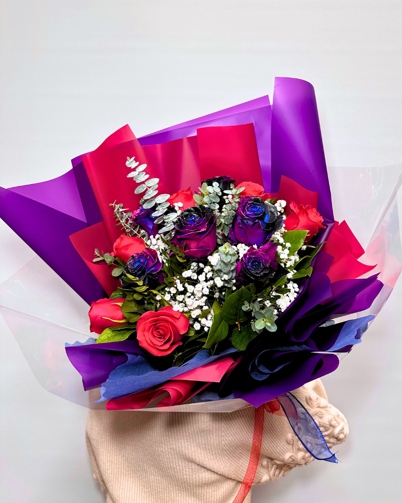 Explore the cosmic wonders of love with our Enchanted Twilight Rose Bouquet, a dozen rose bouquet featuring six striking red or hot pink roses and six exclusive imported roses resembling a celestial galaxy. The mesmerizing blend of blues, pinks, purples, and black petals makes this bouquet a unique expression of love.