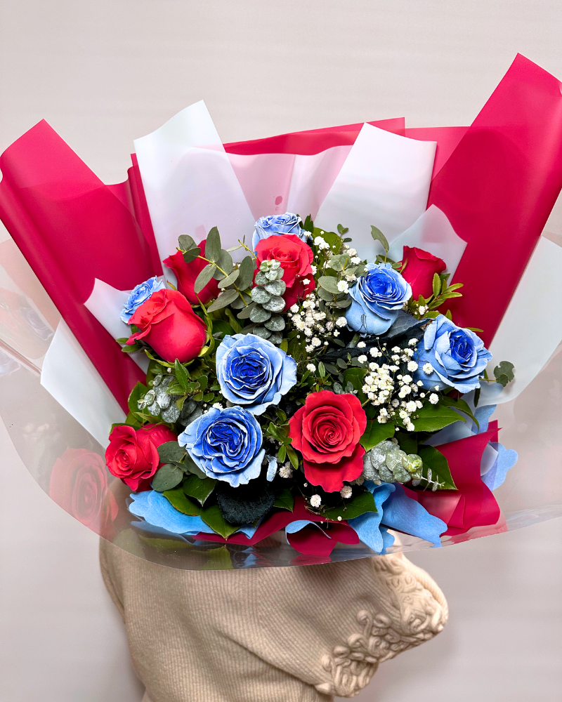 Indulge in the extraordinary beauty of love with our Ruby & Sapphire Rose Bouquet, a bouquet of one dozen roses with six vibrant red or hot pink roses and six imported blue roses. The exclusive blue roses have a deeper blue centre with light blue petals on the outside to create a mesmerizing glow.